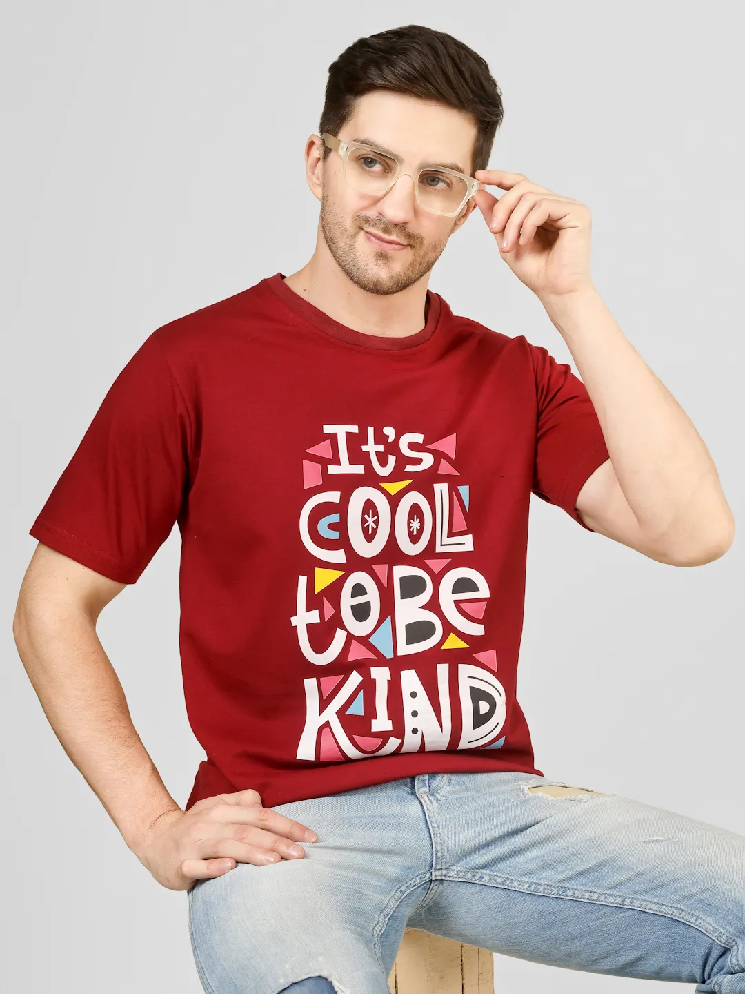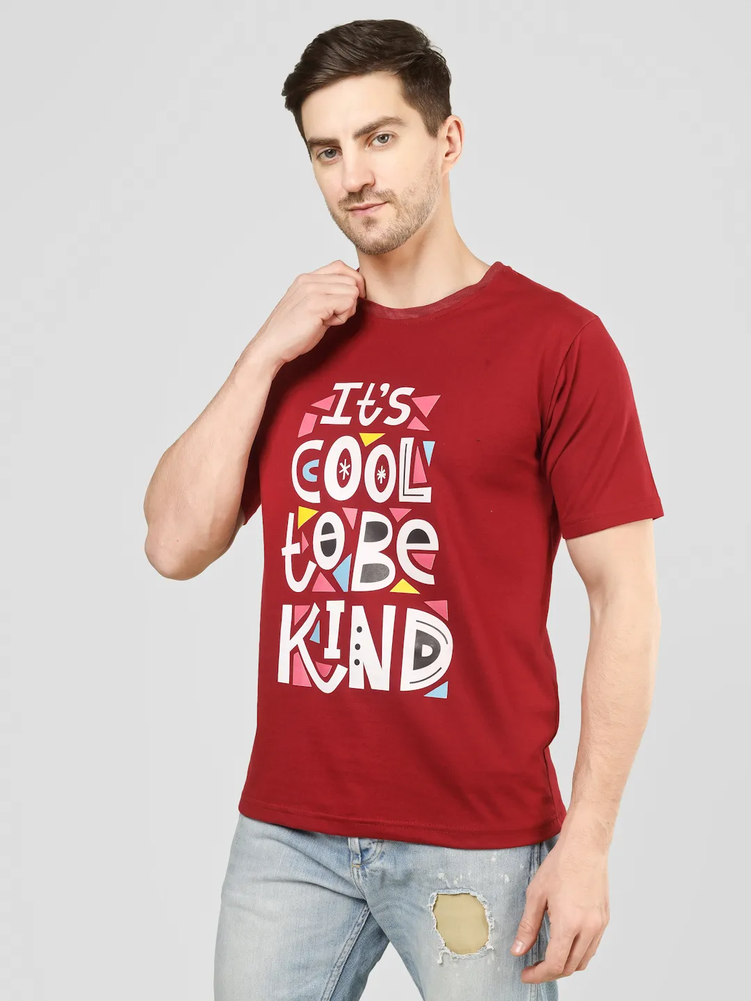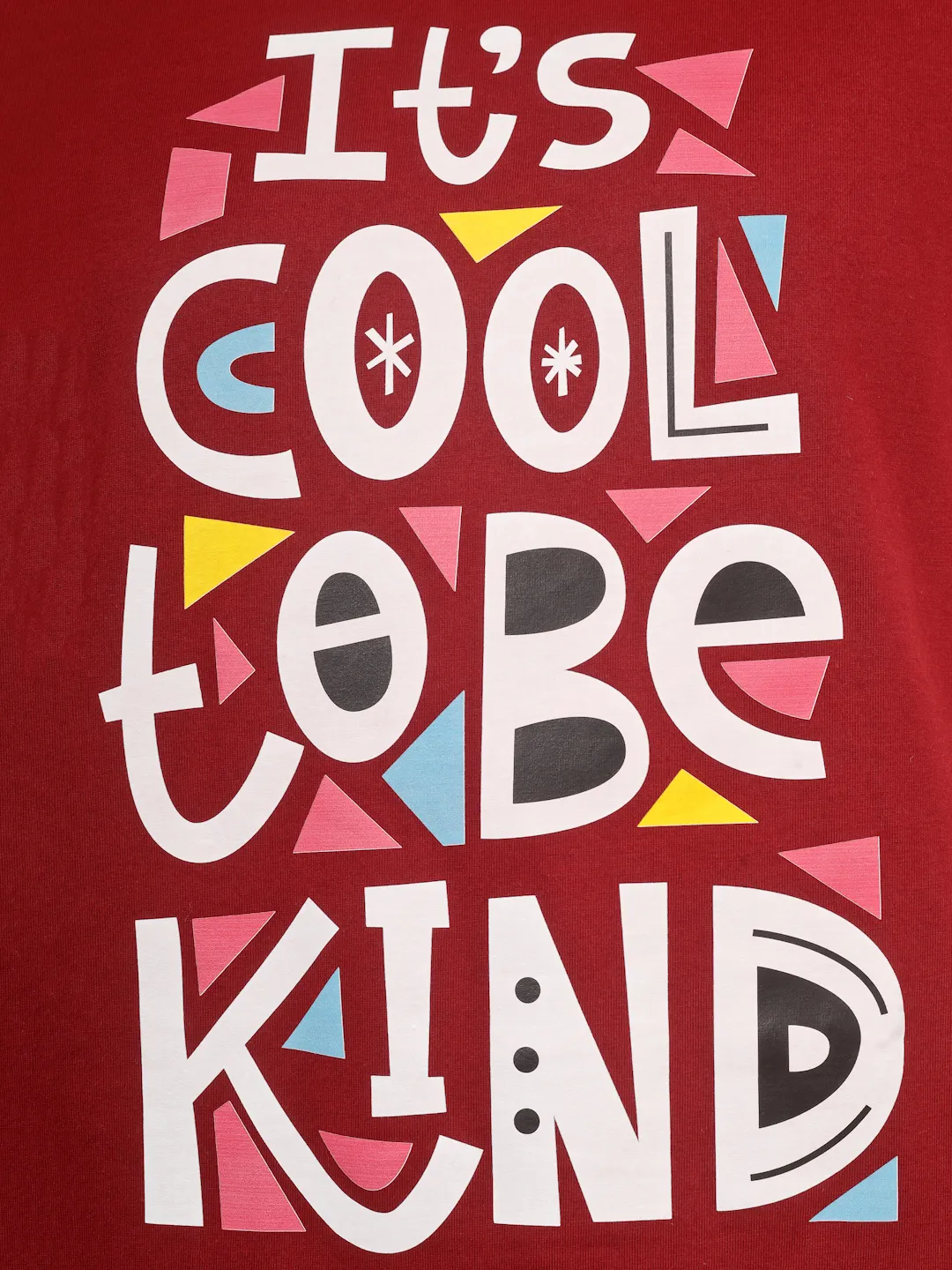 Add a positive vibe to your everyday style with this maroon printed t-shirt. Featuring a vibrant “It’s Cool to Be Kind” typography on the front, this piece blends comfort with a meaningful message. Made from cotton fabric, it offers a soft feel, breathable comfort, and a durable structure, making it perfect for daily wear. The rich maroon color enhances its appeal while keeping your look effortlessly stylish.