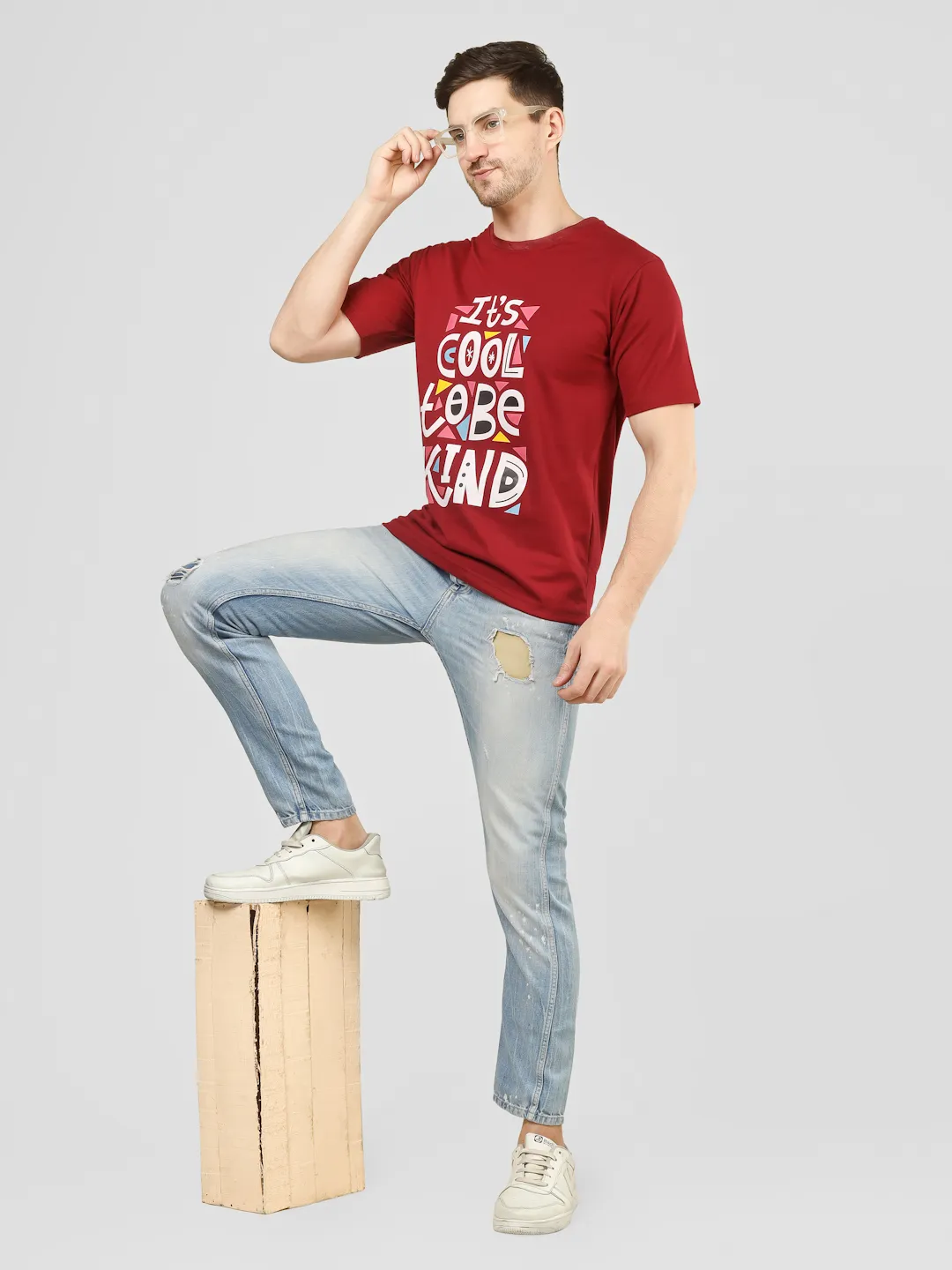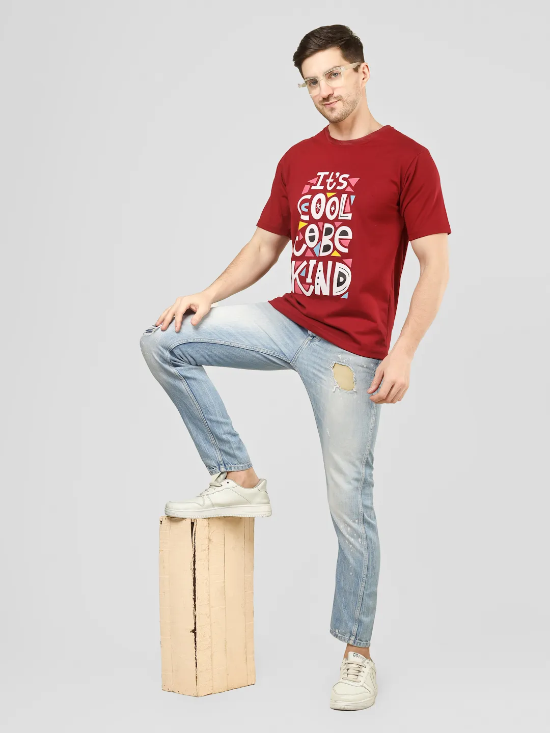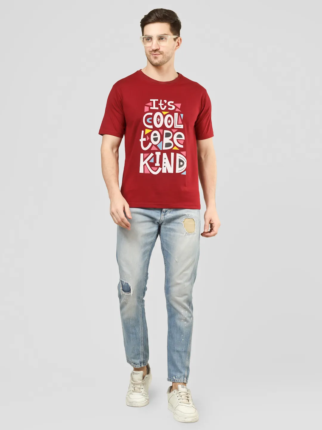 Add a positive vibe to your everyday style with this maroon printed t-shirt. Featuring a vibrant “It’s Cool to Be Kind” typography on the front, this piece blends comfort with a meaningful message. Made from cotton fabric, it offers a soft feel, breathable comfort, and a durable structure, making it perfect for daily wear. The rich maroon color enhances its appeal while keeping your look effortlessly stylish.